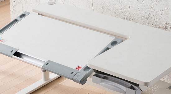 Поверхность столешницы очень функциональна, благодаря её разделению на две независимые друг от друга зоны: одна из которых наклонная рабочая, за ней ребёнок пишет, читает и рисует, а вторая горизонтальная вспомогательная, на которой можно удобно расположить дополнительную литературу для подготовки уроков, настольную лампу, монитор. С правой стороны, под столешницей, имеется дополнительный выдвижной ящик. Все это о и делает его уникальным столом, который выгодно отличается от всех остальных.