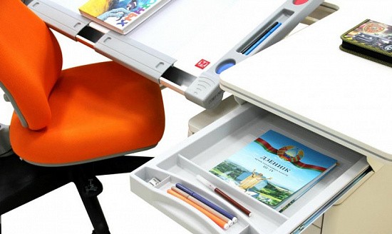 Компактный ящик с органайзером, который расположен под фиксированной частью столешницы, дает возможность хранить школьные предметы и мелкие канцтовары.