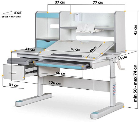 Высота стола регулируется с помощью червячного механизма ручкой. Как вы, так и ваш ребенок, сможете с легкостью отрегулировать стол, а благодаря шкале роста, изображенной на ножках, это будет сделать еще проще. Ручку можно разместить с любой стороны стола.