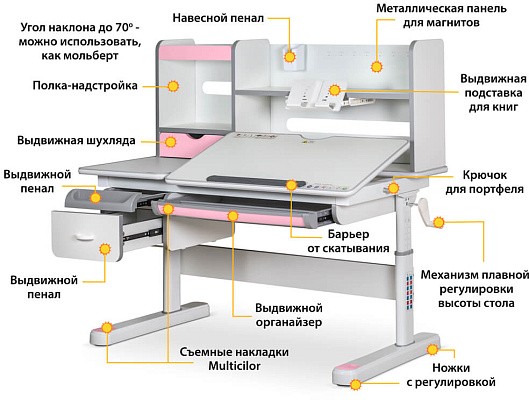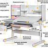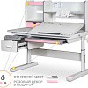 Важной особенностью данного стола является наличие сменных цветных накладок. Приобретайте стол серого цвета и получите на выбор голубые, либо розовые накладки. Накладки меняются на ножках, пластиковом выдвижном органайзере, выдвижном ящике и полочке на надстройке. Меняйте цвет декора в зависимости от настроения вашего ребенка!