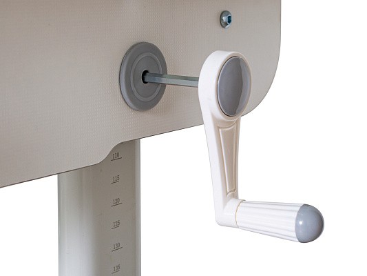 Высота стола регулируется с помощью червячного механизма ручкой, которую при сборке можно установить справа, либо слева.