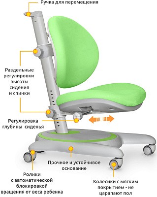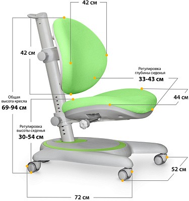 У кресла независимая регулировка высоты спинки и сиденья. Регулировка осуществяется с помощью специальных винтов на металлической несущей трубе Глубина сиденья регулируется ручкой -фиксатором. Кресло подойдет для детей от 3х лет до взрослого возраста.