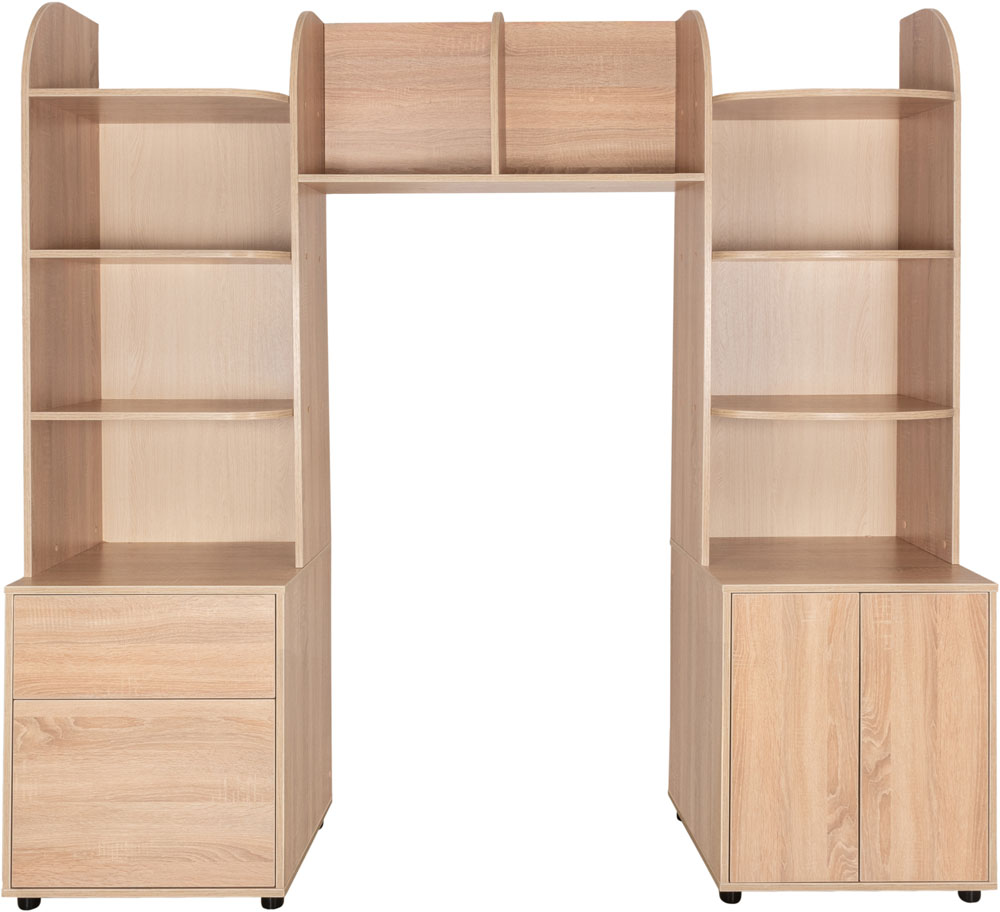 Комплект состоит из двух стеллажей с закругленными полками и двух вместительных тумб. Одна из тумб с ящиками, вторая - с распашными дверцами. Ящики и дверцы открываются простым нажатием на них. Навесная полка крепится между стеллажей. Комплект отлично впишется в интерьер любой комнаты, не только детской. Школьные принадлежности, канцелярия и аксессуары разместятся внутри ящиков.